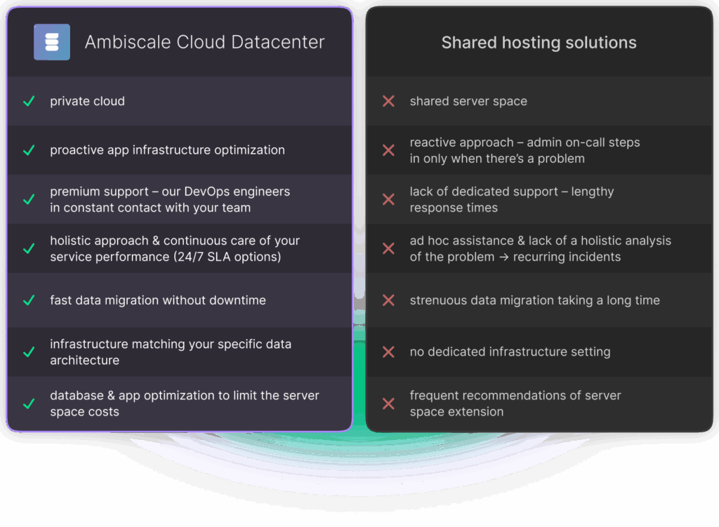 You get more than a hosting service. It’s a comprehensive, high-level maintenance private cloud tailored to your infrastructure requirements. Benefit from proactive database optimization, continuous upkeep, regular audits, and premium support. Consistent uptime, fast response times, and complete data protection – we handle it all for you.